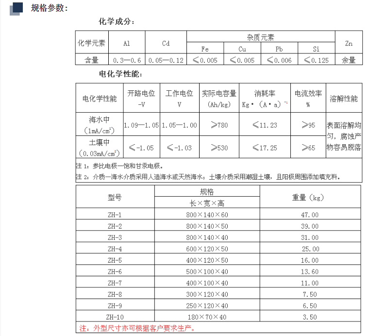 電化學(xué)性能優(yōu)越:具有極高的電化學(xué)性能,單位重量的陽極材料發(fā)電量大,約為鎂陽極的 2/3 倍,在海水及含氯離子的其他介質(zhì)中,性能良好,發(fā)出電流的自調(diào)節(jié)能力強(qiáng)。
