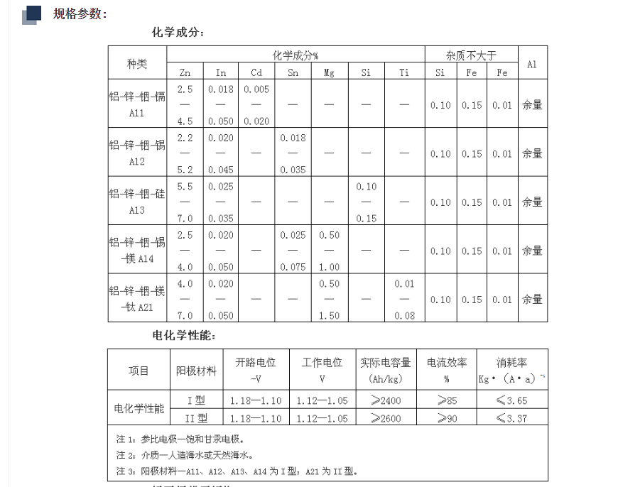 我公司生產(chǎn)的鋁合金犧牲陽(yáng)極采用優(yōu)良的原材料(鋁陽(yáng)極原料純度不低于90%)多重質(zhì)檢工藝(雜質(zhì)質(zhì)檢、金相顯微分析、全套化學(xué)分析),